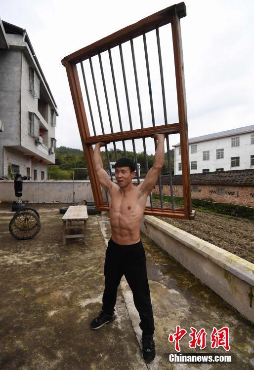 杀猪桌、石头、破旧的窗户、黑色长绳、由自来水管焊成的单杠、竹竿。在福建省龙岩市长汀县童坊镇举河村31岁的黄海木不办健身卡,不买专业健身装备,就地取材,靠家里的杀猪桌、竹竿练出了迷人马甲线和腹肌。
