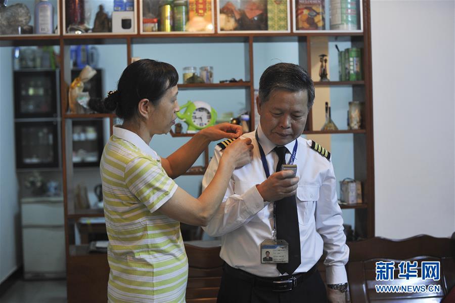 3月15日清晨5点多,何福强的妻子早早起床为准备出发的老何整理制服。 3月15日是南方航空公司机长何福强的60岁生日,他和机组人员共同执行海口至重庆的往返航班任务,这也是他38年飞行生涯的最后一次飞行。何福强的飞行生涯从部队时期开始,先后执飞过7种不同型号飞机,累计飞行时间约2.4万小时,曾获中国民航安全飞行金质奖章。 新华社发(徐勤涛 摄)