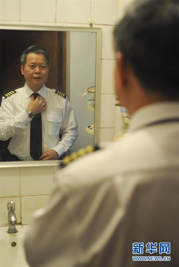 3月15日清晨5点多,何福强在家中对着镜子整理制服。 3月15日是南方航空公司机长何福强的60岁生日,他和机组人员共同执行海口至重庆的往返航班任务,这也是他38年飞行生涯的最后一次飞行。何福强的飞行生涯从部队时期开始,先后执飞过7种不同型号飞机,累计飞行时间约2.4万小时,曾获中国民航安全飞行金质奖章。 新华社发(徐勤涛 摄)