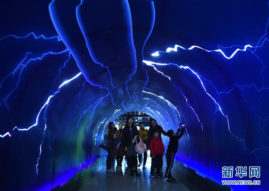 3月23日,市民在杭州气象科普体验馆“雷电通道”体验模拟的雷电场景。