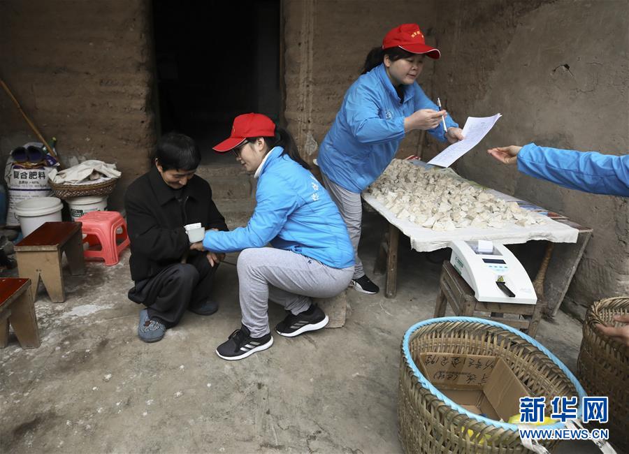 陶家镇友爱村18社五保户朱崇德家,上门体检的“背篓医生”在为小儿麻痹症患者朱崇德(左)量血压(2月20日摄)。新华社记者 兰红光 摄