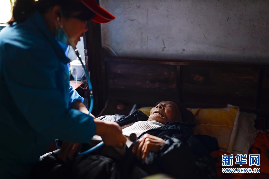 陶家镇治安村18社刘宴清侄女家中,“背篓医生”在为100岁的老人刘宴清(右)进行体检(2月20日摄)。 新华社记者 刘潺 摄