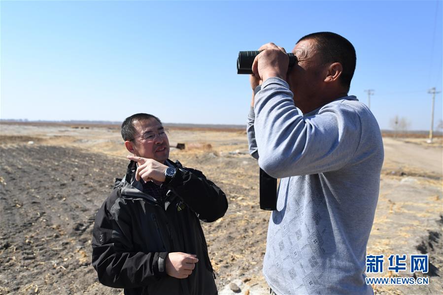 4月12日,在吉林省白城市镇赉县莫莫格蒙古族乡米太村谢台庙屯,潘晟昱(左)向护鸟志愿者马彦介绍观察候鸟的方法。 在吉林省白城市镇赉县有位拍摄白鹤的摄影爱好者名叫潘晟昱,人称“鸟叔”。他与白鹤的情缘已经持续了12年,他用镜头见证了这个物种的种群数量和栖息地点逐步恢复的过程。 如今,潘晟昱已经从一名摄影爱好者成长为一位热衷生态保护的志愿者。 新华社记者 张楠 摄