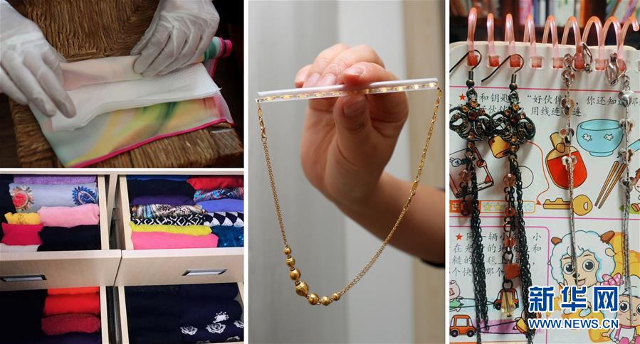 4月24日,职业收纳师辜井在上海市嘉定区一户社区居民家中进行“换季收纳指导”公益服务。这是辜井展示收纳方法的拼版照片:收纳丝巾时卷入纸巾不易皱(左上图)、抽屉衣物的收纳(左下图)、用吸管收纳项链不会缠绕打结(中图)、改造旧台历进行饰品收纳(右图)。 作为一名职业收纳师,辜井和她的团队已为上海近300个社区家庭进行了免费收纳整理指导与样板打造。 学医出身、曾在医疗领域服务10余年的辜井,一次偶然机会接触到收纳,这使她找到了自己新的职业和人生目标。辞职创业后,辜井在全国完成了400多场收纳课程分享,将先进的收纳理念、科学的收纳方法带给众多家庭。2019年4月,辜井获得“2019上海青年社区能人”称号。 新华社记者 刘颖 摄