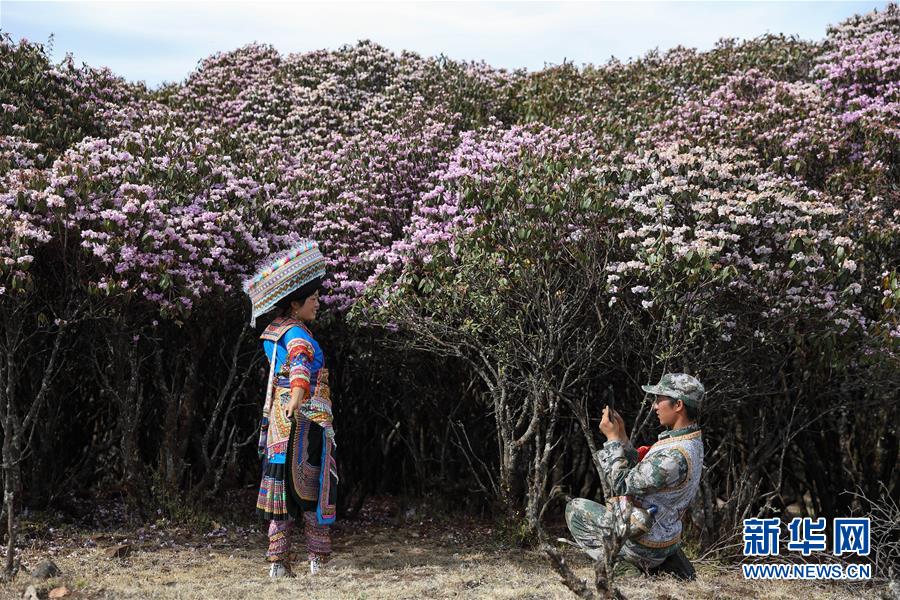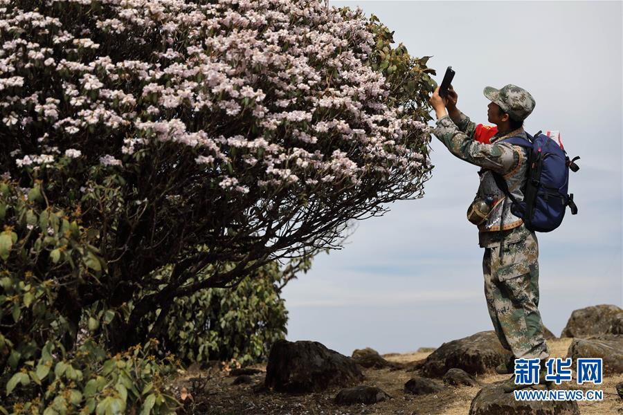 4月23日,护林员杨洪坤在龙头山杜鹃花海中拍照。 新华社记者 江宏景摄
