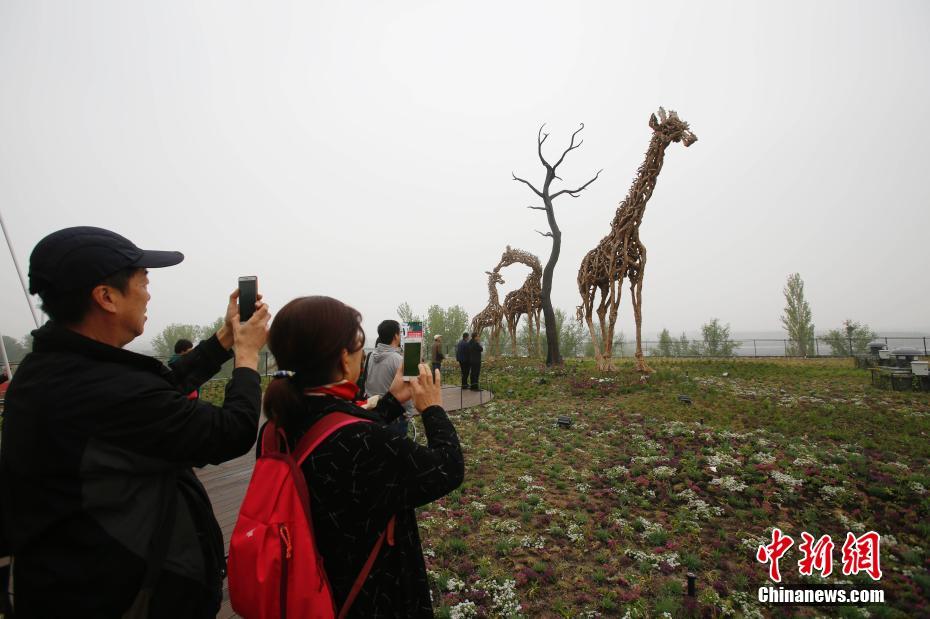 4月29日,2019年中国北京世界园艺博览会(简称北京世园会)开园。图为市民欣赏《莫莉和她的一家人》艺术品。中新社记者 韩海丹 摄