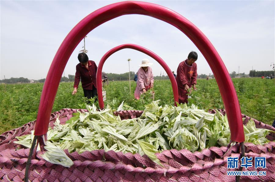 5月14日,在河北省邯郸市磁县讲武城镇小寨村艾草产业扶贫基地,农户在采摘艾草嫩芽,用于制作艾茶。 近年来,河北省邯郸市磁县通过技术攻关,因地制宜推广艾草种植,以“企业+合作社+基地+农户”的方式,打造集艾草种植、生产加工、经营销售、艾灸培训等为一体的多元化、综合性产业。目前,当地已播种艾草1200亩,生产艾茶、艾条、艾绒、艾饼等10余种产品,帮助农户实现增收。 新华社发(郝群英 摄)