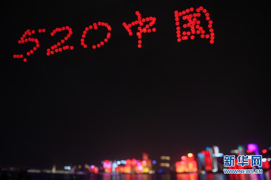 5月20日,约150架无人机空中编队在钱塘江上空组成“520中国”字样。 当晚,在浙江杭州钱塘江畔,城市灯光秀和约150架无人机组成的空中编队表演交相辉映。“520中国”“我爱你中国”“70年”……对祖国进行的一场“深情告白”闪耀钱塘两岸。 新华社记者黄宗治摄