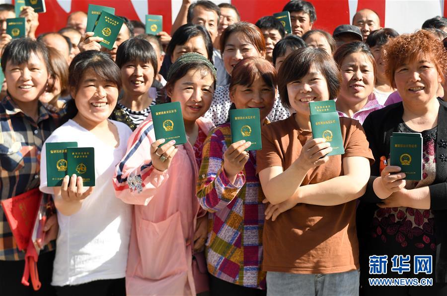 5月21日,在陕西省三原县陵前镇,培训合格的农民领到新型职业农民证书。 当日,陕西省三原县的300名农民学员完成在陕西省农业广播电视学校三原分校4所田间学校的学习,获得新型职业农民证书。 近年来,三原县开展了多层次、多渠道、多形式的新型职业农民技能培训工作。截至目前,已有1173人获得新型职业农民资格认定,全县由新型职业农民创办的专业合作社和家庭农场达到128个。 新华社记者 刘潇 摄