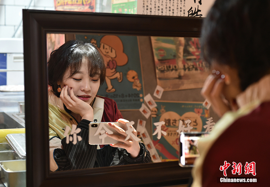 在她的成长过程中父母对她最大的担心就是怕她吃不饱,在大学毕业之前,父母一直跟着她,给她做饭。聊到感情,她回应道“不着急,顺其自然吧!”问到会不会担心因为自己的食量吓跑喜欢她的男孩子,她很耿直的说,“不怕,这是必须接受的吧!” 图为mini在写着“你今天不好看”的镜子前自拍。中新网记者 翟璐 摄