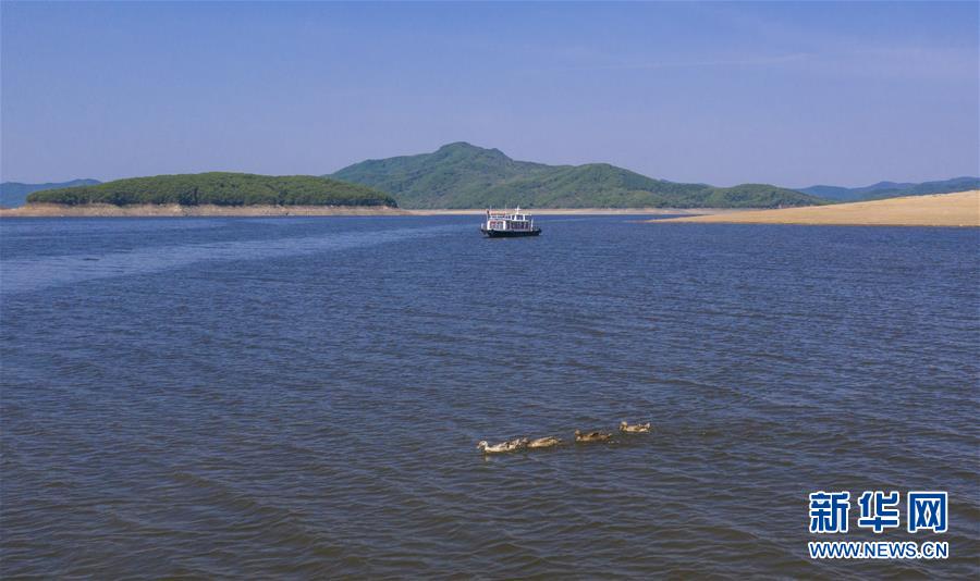 在吉林市松花湖,几只野生水禽在水面上游弋(5月12日无人机拍摄)。 新华社记者许畅摄