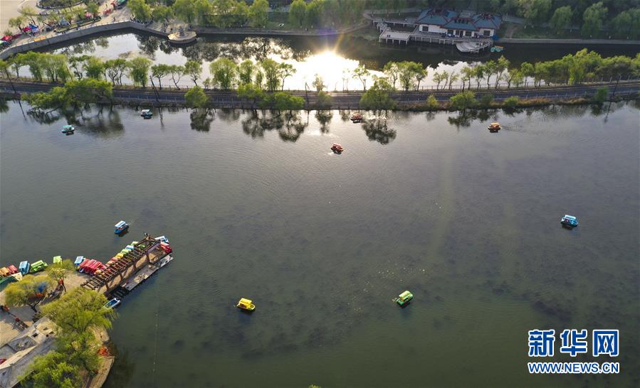在吉林市北山公园,游人在湖面划船游玩(5月11日无人机拍摄)。 新华社记者许畅摄