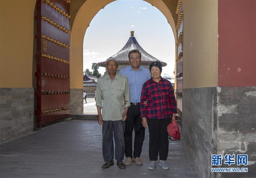 5月27日,中建三局三公司北京分公司员工徐锋锋(中)与父母在天坛景区合影留念。