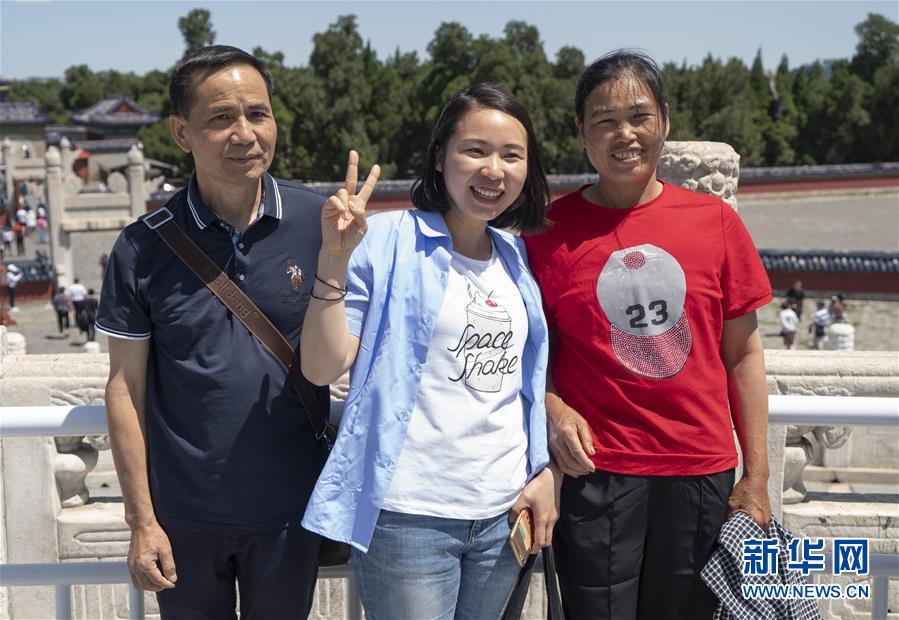 5月27日,中建三局三公司北京分公司员工罗达妮(中)与父母在天坛景区内合影留念。