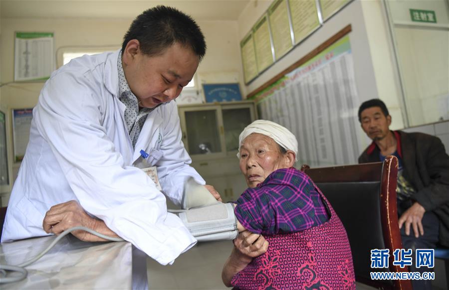 5月28日,何永清(左)在村卫生室为群众诊疗。 新华社记者 陶明 摄