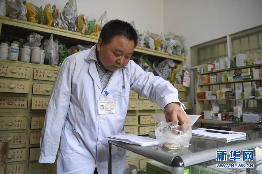 5月28日,何永清在村卫生室为就诊群众配制中草药。新华社记者 陶明 摄