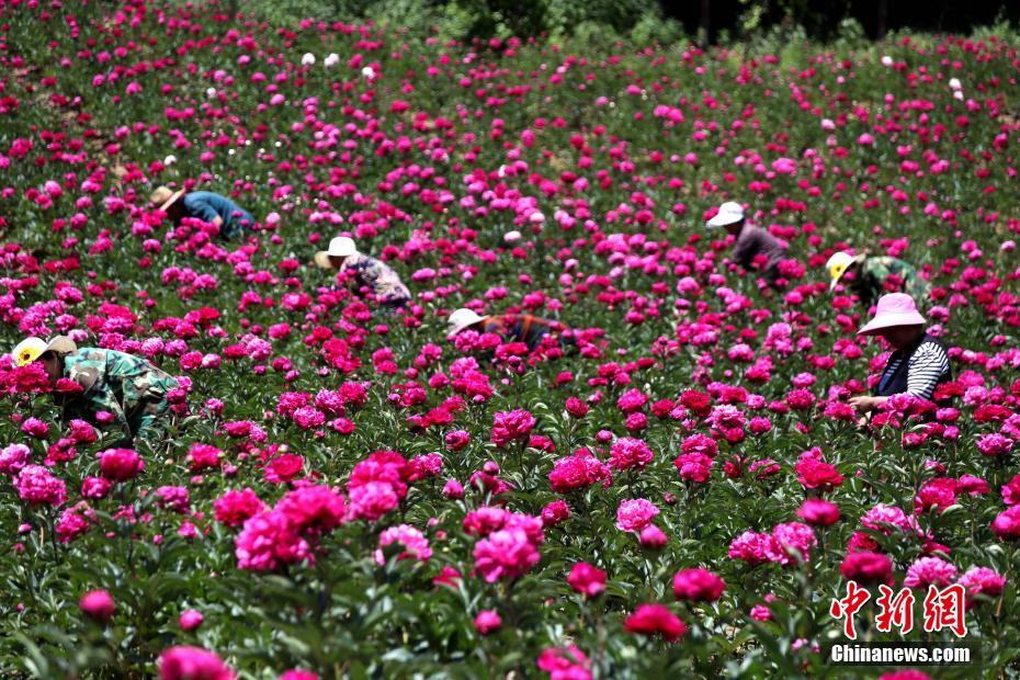 6月2日,河南洛阳赤土店镇的千亩牡丹芍药竞相开放,民众在花田摆起数百米的长桌宴,在花间品味特色农家宴。据介绍,目前赤土店镇大力发展高山牡丹芍药鲜切花产业,在九鼎沟沿线32公里流转土地1300余亩,种植牡丹、芍药等两大类80多个品种鲜花。牡丹芍药鲜切花除了满足国内市场,还大量销往大洋洲、欧洲等国家。图为当地护花群众正在花间劳作。王中举 摄