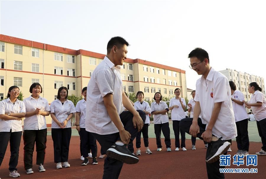 6月2日,在山东省滨州市博兴县第三中学,高三学生在操场上做游戏放松心情。高考临近,山东省滨州市博兴县第三中学组织高三学生参加趣味游戏,帮助学生放松心情,迎接高考。新华社发(陈彬 摄)