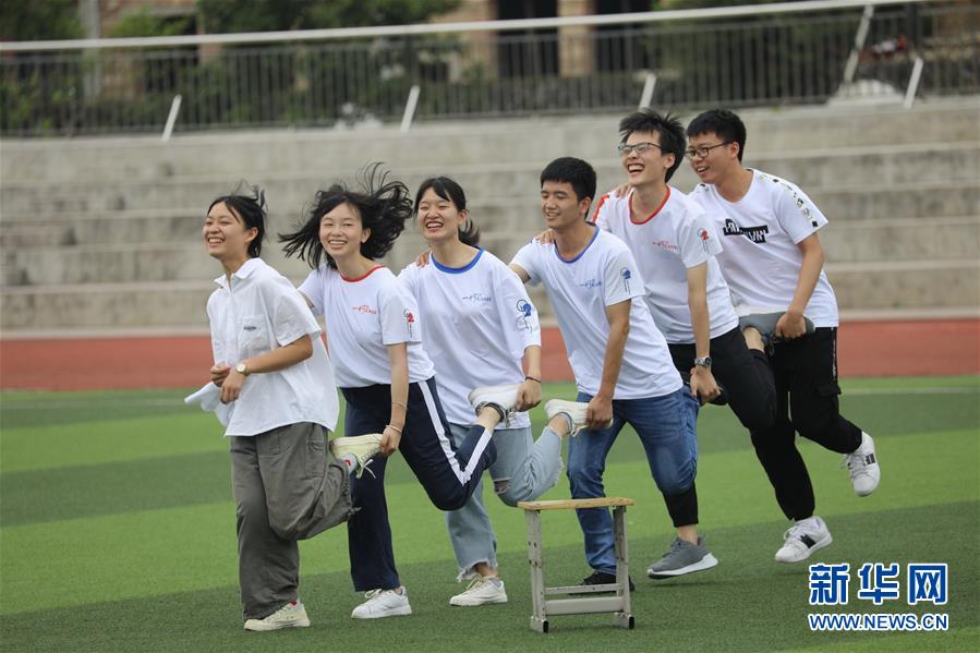 6月2日,在山东省滨州市博兴县第三中学,高三学生在操场上做游戏放松心情。新华社发(陈彬 摄)