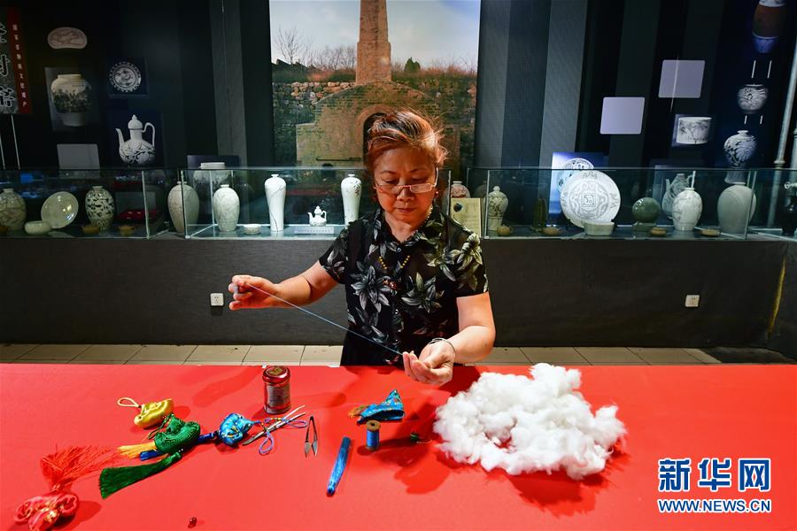 在郑州市非物质文化遗产展示馆,芦爱玲正在制作香包(6月2日摄)。