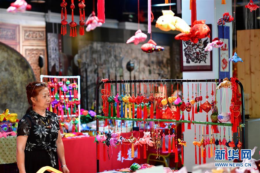 在郑州市非物质文化遗产展示馆,芦爱玲在查看展出的香包(6月2日摄)。 新华社记者 冯大鹏 摄