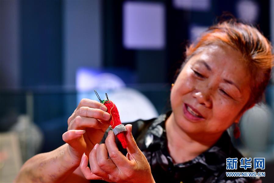在郑州市非物质文化遗产展示馆,芦爱玲展示自己制作的红辣椒形状的针线包(6月2日摄)。 新华社记者 冯大鹏 摄