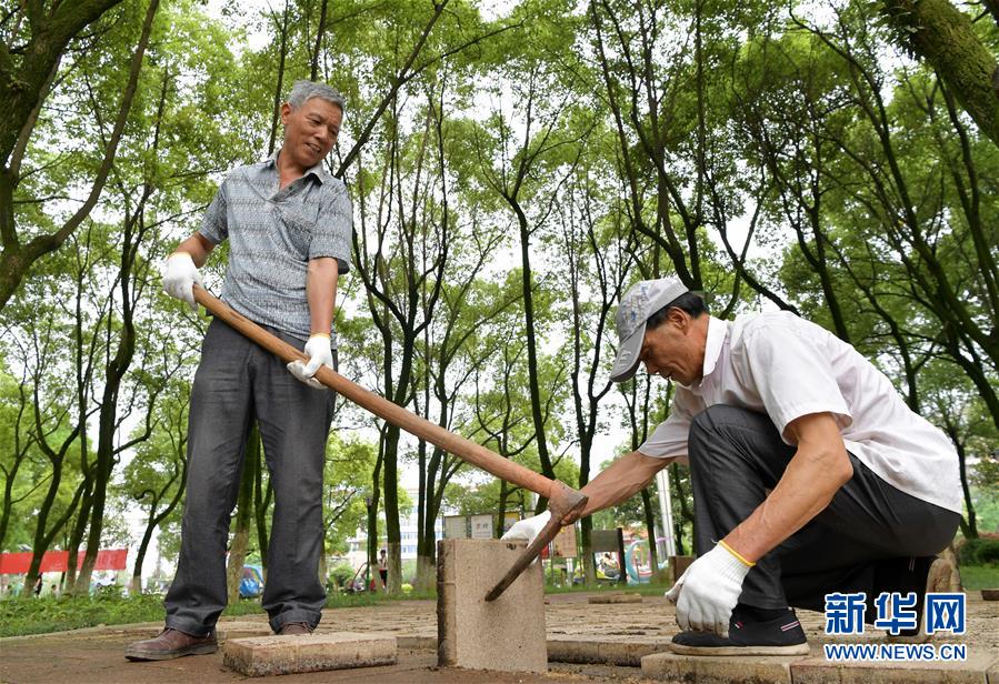 在江西省萍乡市鹅湖公园,工人在铺设透水砖。每逢下雨时,雨水可以快速渗入地砖下的泥土和管网中,而雨水也将逐步分配到城市大大小小的蓄水池,到必要的时候再进一步分排入湖泊、河流(5月28日摄)。 新华社记者 彭昭之 摄 图片来源:新华网