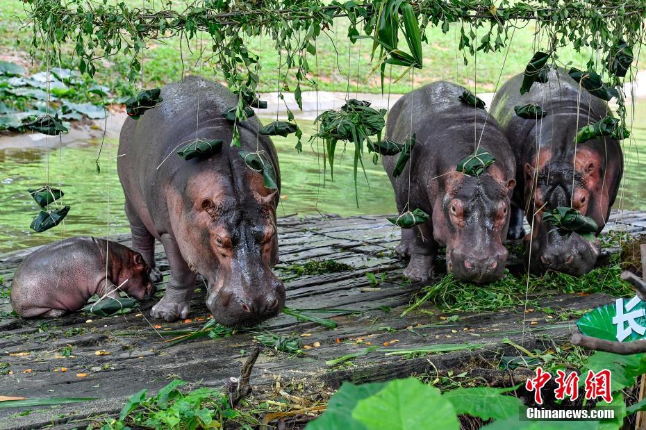 广州长隆河马家族吃“粽子”迎端午
