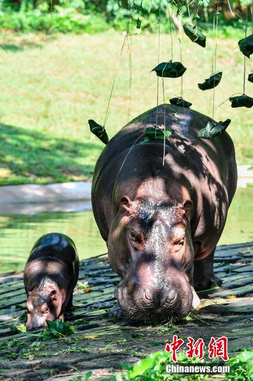 6月6日,端午节前夕,生活在广州长隆野生动物世界的河马妈妈“南荷”吃着用水草特制的“粽子”,其即将满月的河马宝宝首次与游客见面。中新社记者 陈骥旻 摄