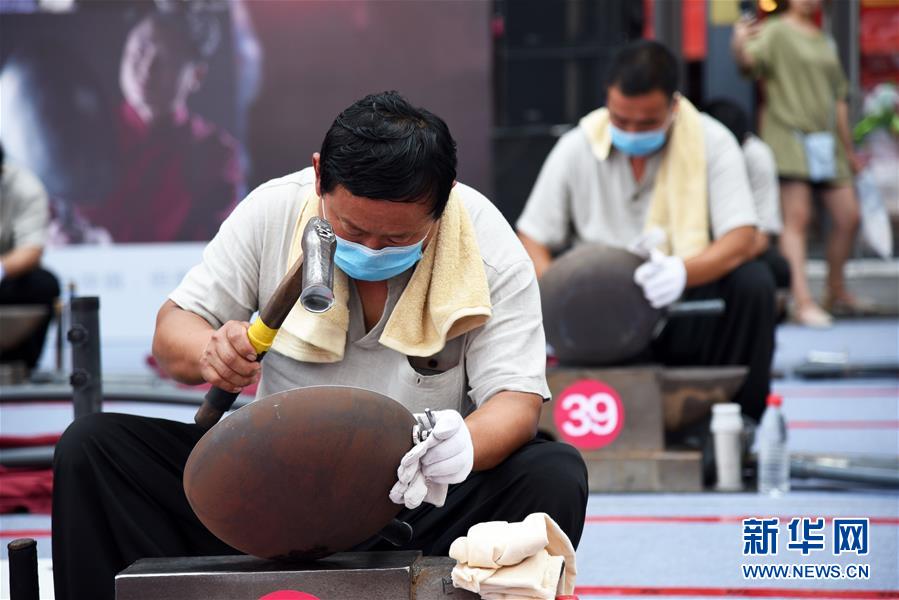 6月7日,章丘打锅工匠在现场演示章丘铁锅的冷锻技艺。 当日,济南世茂广场举行一场章丘铁锅锻打现场展演义卖活动。70位来自章丘的打锅工匠在现场演示章丘铁锅的冷锻技艺,现场打造及展示的产品均采用义卖的形式销售,所得善款全部捐助慈善机构。 新华社记者 王凯 摄