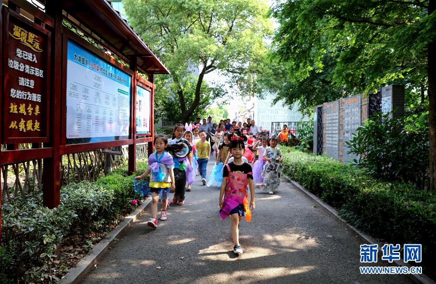 6月7日,图影幼儿园的孩子们穿着用塑料袋、纸盒和废布等制作的环保服装,宣传环保。 当日,浙江省长兴县太湖图影旅游度假区管理委员会组织图影幼儿园开展“垃圾分类从我做起”乡村垃圾分类环保宣传活动。幼儿园的老师和孩子们通过在小沉渎村进行环保服装走秀、垃圾分类游戏以及给村民分发宣传手册等方式,向村民普及垃圾分类知识、推广低碳环保的生活方式。 新华社记者 徐昱 摄