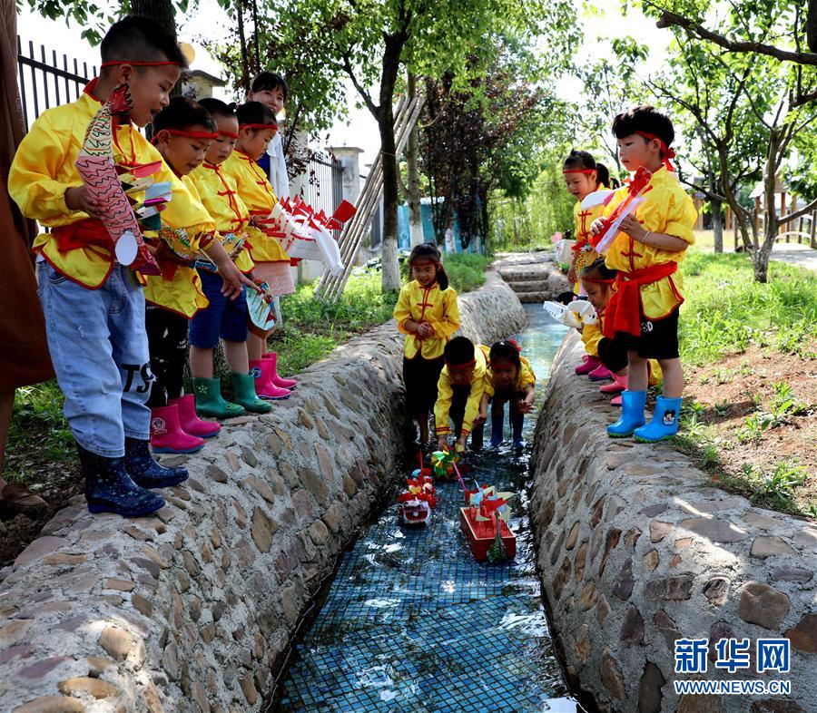 6月7日,图影幼儿园的孩子们将用废纸和纸盒制作的龙舟放在水里赛龙舟。 当日,浙江省长兴县太湖图影旅游度假区管理委员会组织图影幼儿园开展“垃圾分类从我做起”乡村垃圾分类环保宣传活动。幼儿园的老师和孩子们通过在小沉渎村进行环保服装走秀、垃圾分类游戏以及给村民分发宣传手册等方式,向村民普及垃圾分类知识、推广低碳环保的生活方式。 新华社记者 徐昱 摄