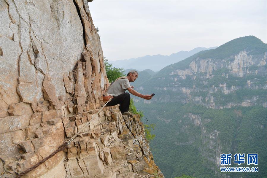 6月10日,村民夏家爱用手机拍摄“天心眼”的美景。 地处大山深处的湖北省恩施土家族苗族自治州巴东县大支坪镇尚家村,壁立千仞,风光壮美。为改变贫困落后的面貌,今年51岁的村民陈显兵从2017年开始,在村里的支持下,带领群众开始在“天心眼”绝壁上修路,目前已修出了一条几公里长的简易观光山路。乡亲们希望这里的绝壁美景能够被开发,通过发展旅游,带动村民致富。 新华社发(杨顺丕 摄)