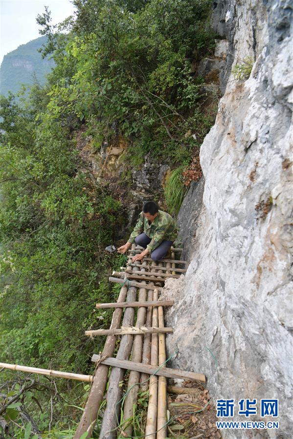 6月10日,陈显兵在悬崖上加固简易木桥。 地处大山深处的湖北省恩施土家族苗族自治州巴东县大支坪镇尚家村,壁立千仞,风光壮美。为改变贫困落后的面貌,今年51岁的村民陈显兵从2017年开始,在村里的支持下,带领群众开始在“天心眼”绝壁上修路,目前已修出了一条几公里长的简易观光山路。乡亲们希望这里的绝壁美景能够被开发,通过发展旅游,带动村民致富。 新华社发(杨顺丕 摄)