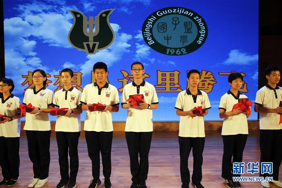 6月19日,北京五中分校初三年级学生在展示学校颁发的毕业证书。 当日,北京五中教育集团2019届高三年级及五中分校初三年级学生毕业典礼分别在东城区图书馆剧场和中山公园音乐堂举行。毕业生们领取了毕业证书,并向老师献花,感谢师恩。 新华社发(周良 摄)