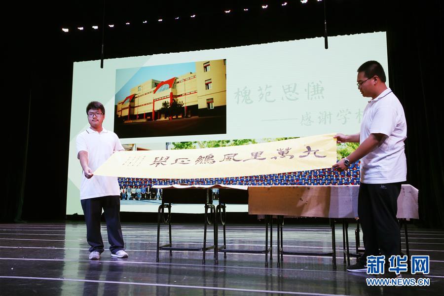 6月19日,北京五中高三年级学生在毕业典礼上展示赠送母校的书法作品。 当日,北京五中教育集团2019届高三年级及五中分校初三年级学生毕业典礼分别在东城区图书馆剧场和中山公园音乐堂举行。毕业生们领取了毕业证书,并向老师献花,感谢师恩。 新华社发(周良 摄)