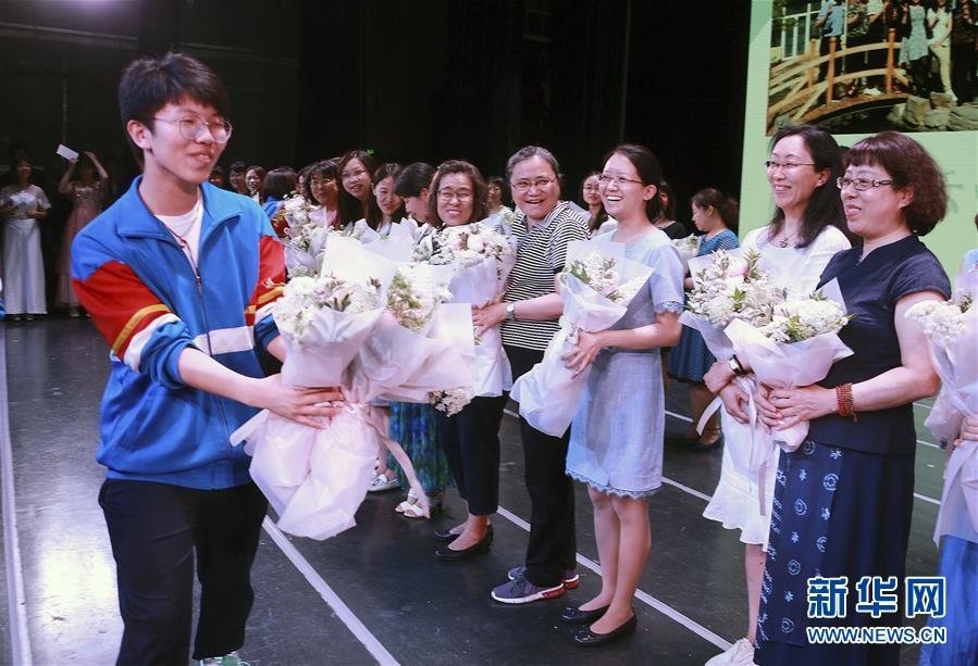 6月19日,北京五中高三年级学生在毕业典礼上向老师献花。 当日,北京五中教育集团2019届高三年级及五中分校初三年级学生毕业典礼分别在东城区图书馆剧场和中山公园音乐堂举行。毕业生们领取了毕业证书,并向老师献花,感谢师恩。 新华社发(周良 摄)