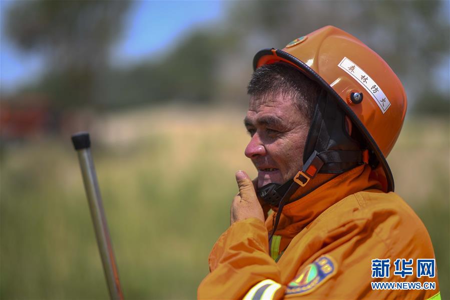 扑火演练结束后,扑火队队员外力·司马义擦拭额头上的汗水(6月19日摄)。 新华社记者 赵戈 摄