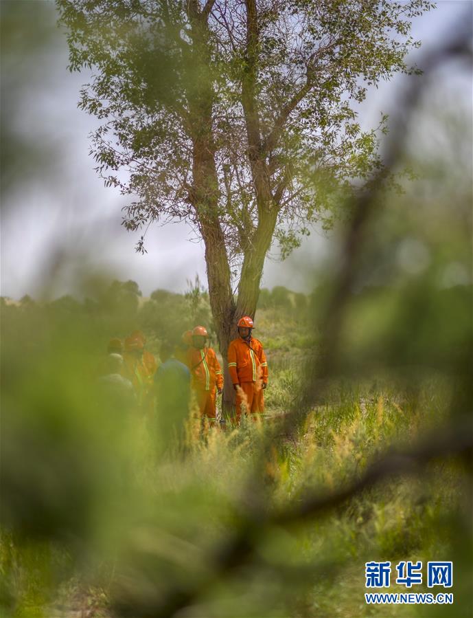 在尉犁县罗布淖尔国家湿地公园内,扑火队队员在为演练做准备(6月19日摄)。 新华社记者 赵戈 摄