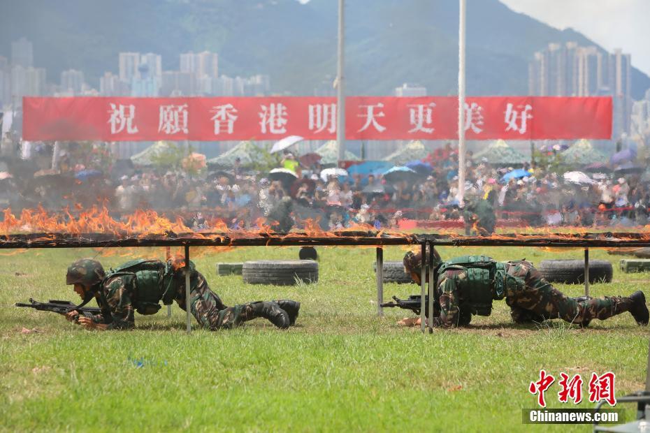 6月30日,解放军驻港部队昂船洲军营举行开放日活动,活动持续2天,共吸引约3万名市民和青年学生入营参观,近距离感受军队、军营和军人所独有的文化和魅力。图为解放军驻港部队特种兵进行猎人战斗表演。 中新社记者 谢光磊 摄
