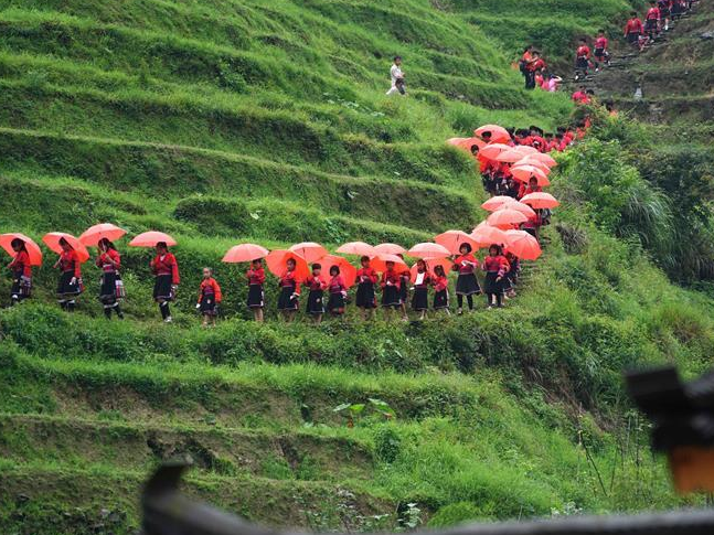 当日是农历六月初六,广西龙胜各族自治县龙脊镇大寨村举办一年一度的晒衣节。晾晒彩衣、织技展示等多姿多彩的民俗活动,吸引了众多游客前来参观。