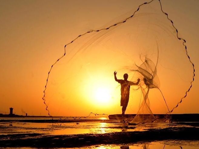 7月7日,在科威特首都科威特城,一名渔民在落日余晖中撒下渔网。