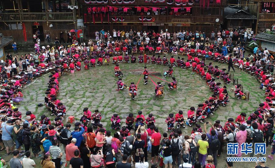 7月8日,在广西龙胜各族自治县龙脊镇大寨村,瑶族妇女展示传统服饰制作技艺(无人机拍摄)。 当日是农历六月初六,广西龙胜各族自治县龙脊镇大寨村举办一年一度的晒衣节。晾晒彩衣、织技展示等多姿多彩的民俗活动,吸引了众多游客前来参观。 新华社发(粟勇主 摄)