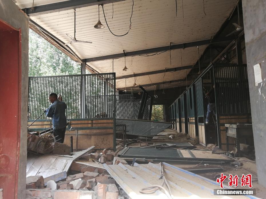7月16日,在郑州市上街区五云山被曝违规修建跑马场、别墅及高尔夫球场等问题后,坐落于山间的高尔夫球场、莱蒙多马场正在实施拆除。据当地官员介绍,拆除期限定为3天,届时,两处场所建筑将夷为平地。对于山间连片的别墅类建筑是否违建以及将如何处置,该官员称,官方会及时发布情况通报。图为处于山间的莱蒙多马场马房正在拆除中。刘鹏 摄