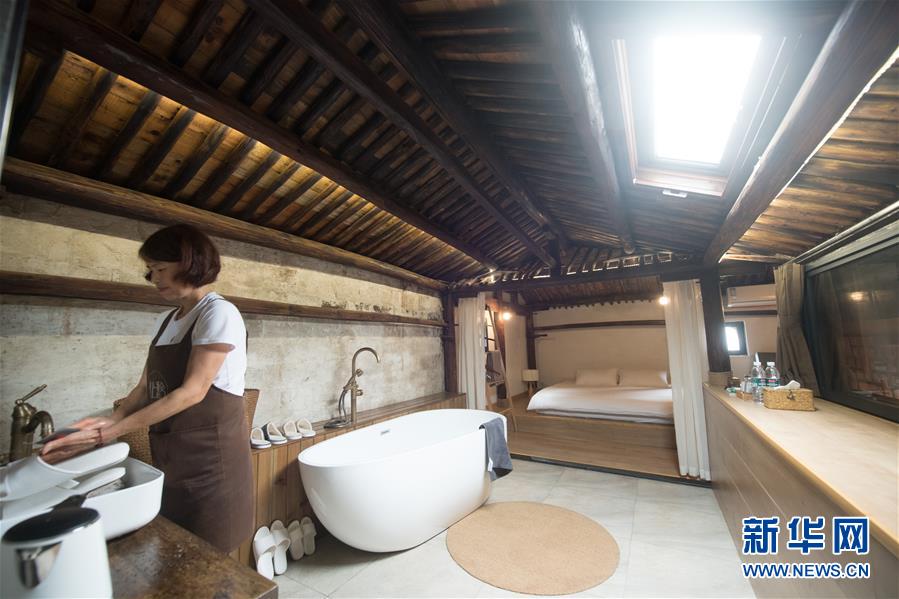 7月16日,工作人员在“村上酒舍”民宿客房内打扫。 新华社记者翁忻旸摄