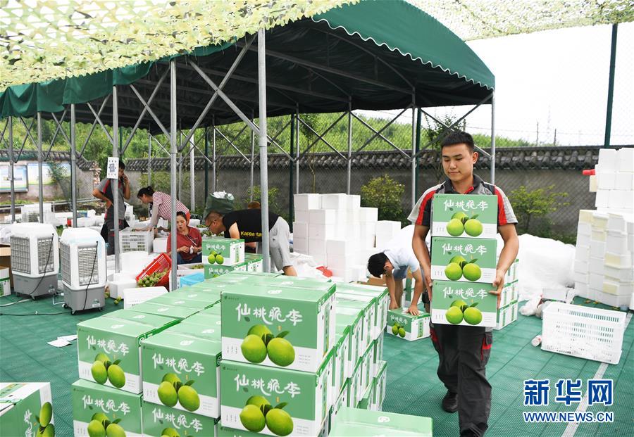 7月19日,物流公司工作人员在古路镇乌牛村仙桃李分装基地搬运打包好的仙桃李。 近日,重庆市渝北区古路镇乌牛村的800余亩仙桃李进入采收期。近年来,古路镇积极引导农民通过“土地入股”“资金入股”“基地就业”等形式参与仙桃李产业,探索“合作社+公司+农民”的模式,促进仙桃李种植的规模化、科学化,在美化生态环境的同时,提升了产业效益,助力乡村振兴和农民增收致富。截至目前,全镇仙桃李种植面积达4000余亩,今年的挂果面积超过1000亩。 新华社记者 王全超 摄