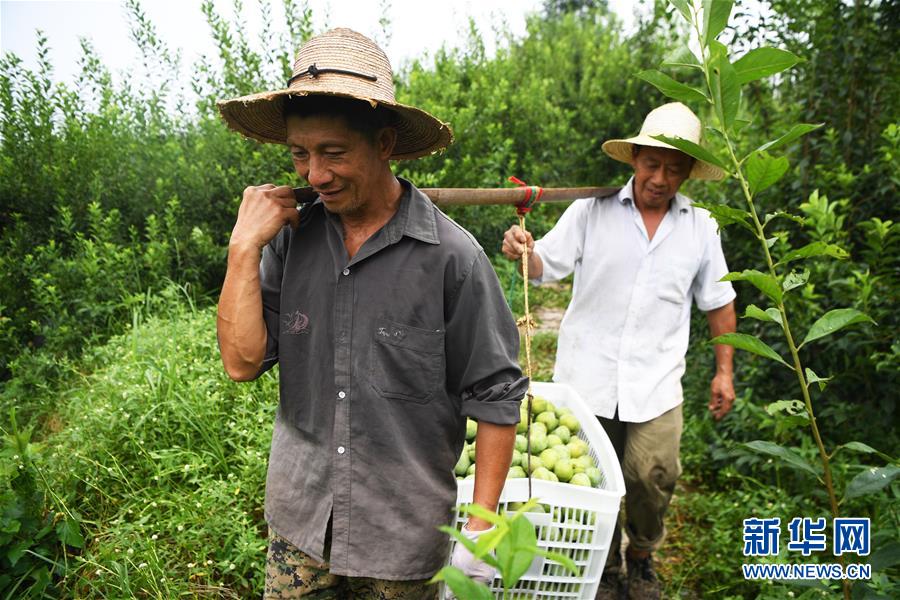 7月19日,古路镇乌牛村村民在仙桃李种植基地抬运刚采摘的仙桃李。 近日,重庆市渝北区古路镇乌牛村的800余亩仙桃李进入采收期。近年来,古路镇积极引导农民通过“土地入股”“资金入股”“基地就业”等形式参与仙桃李产业,探索“合作社+公司+农民”的模式,促进仙桃李种植的规模化、科学化,在美化生态环境的同时,提升了产业效益,助力乡村振兴和农民增收致富。截至目前,全镇仙桃李种植面积达4000余亩,今年的挂果面积超过1000亩。 新华社记者 王全超 摄