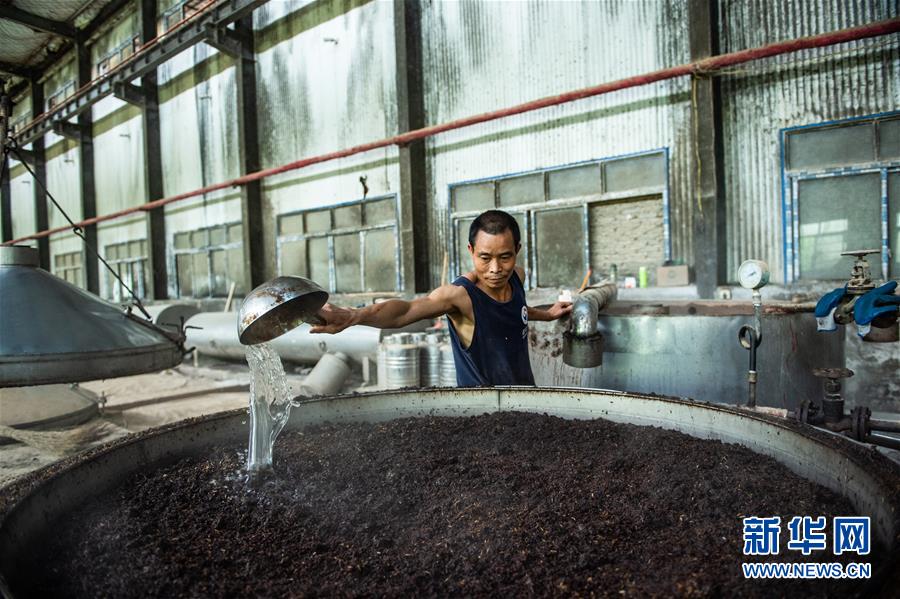 7月21日,酒厂的工人师傅在给糟胚加水。新华社记者 陶亮 摄