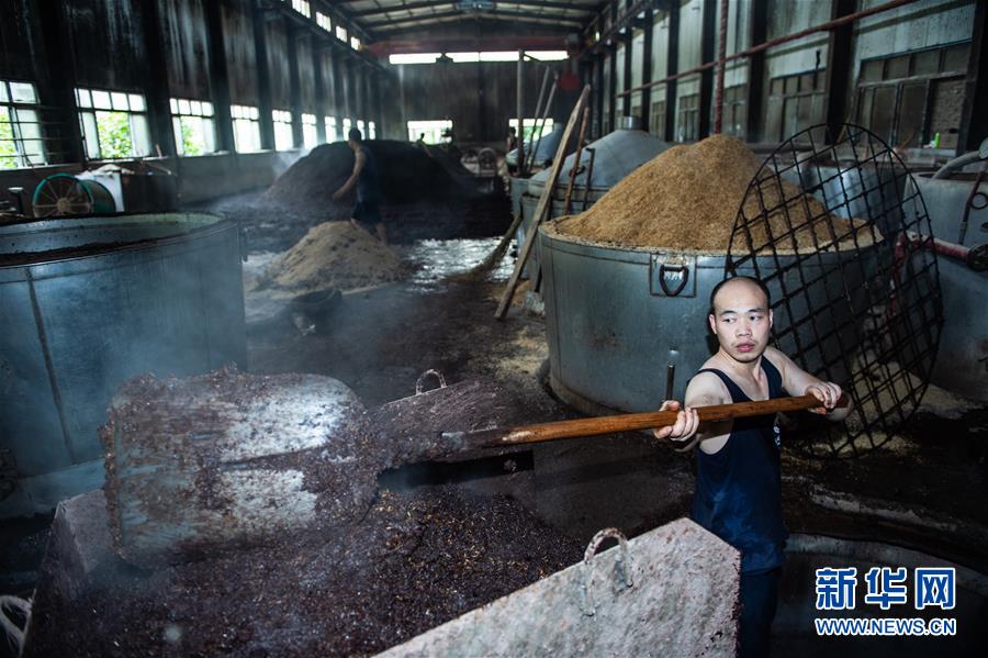 7月21日,酒厂的工人师傅在铲运糟胚。新华社记者 陶亮 摄