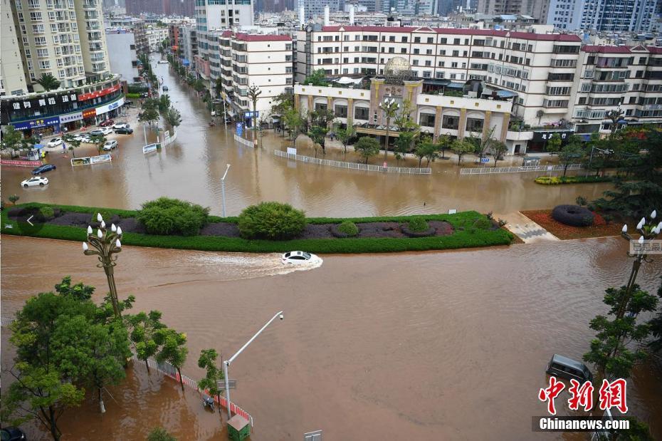 7月21日,经过连续两日的降雨,昆明城区多地积水严重,多条道路交通中断。目前,昆明相关部门正积极处置62个积水点,其中断交积水点15个、未断交积水点21个、轻微积水点26个。从19日开始,昆明市连续强降雨引发城市洪涝,次日一早昆明市区因积水交通中断的路段经交警部门统计有10余个。这是连续三年来,昆明市在雨季暴雨后积水致部分城市排水道“瘫痪”,部分街道积水盖过街面,接近轿车引擎盖。 图为降雨后昆明道路积水严重。刘冉阳 摄